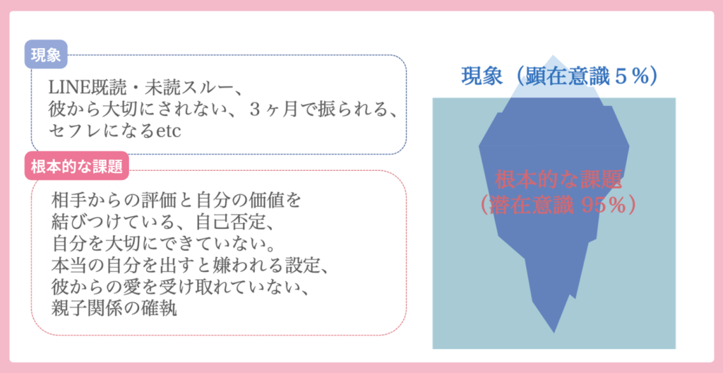 さらに、本来の自分を受け入れずに「こうで無ければいけない」という理想の自分像を演じた状態で相手に接するため、本来の自分に合わないパートナーを引き寄せてしまいます。